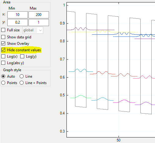 Within graph view, one-dimensional data is displayed as curves. Whether data values are represented as points or lines is up to the user. Antialiasing can be switched on or off via View settings. Additionally, the line thickness, background color or the usage of a grid can be customized.