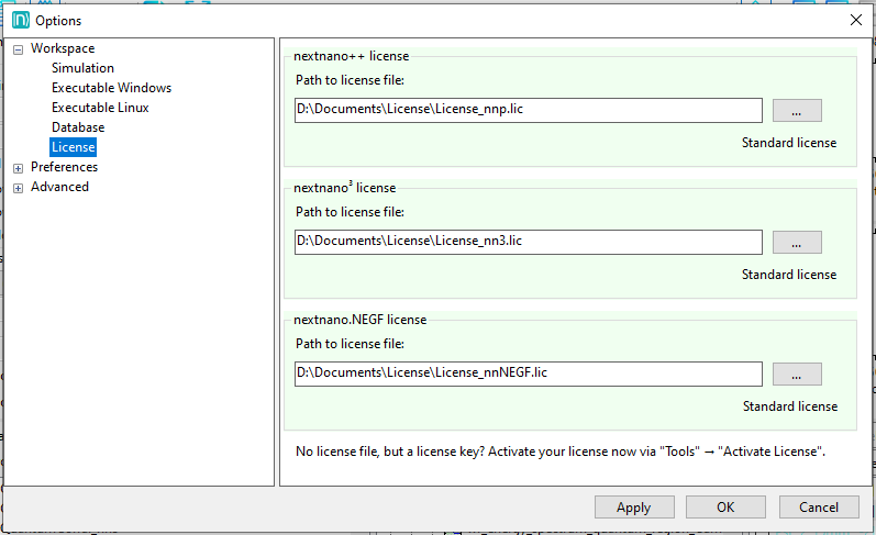 The number of the received files depends on your contract. Each of our products has its own distinctive license file, however License_nnp.lic can be used for both the nextnano++ and nextnano³ tools. After a successful online activation you can choose to automatically update the paths to your license file(s). If you want to update or check the location of the license file(s) manually, go to: