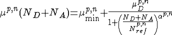 This is one possible model for the mobility parameter µn (for electrons) and µp (for holes) that is used in the drift-diffusion model. The model is taken from the SIMBA manual (Caughey/Thomas model: D. Caughey, R. Thomas, Carrier Mobilities in Silicon Empirically Related to Doping and Field, Proc. IEEE 55, 2192 (1967)).