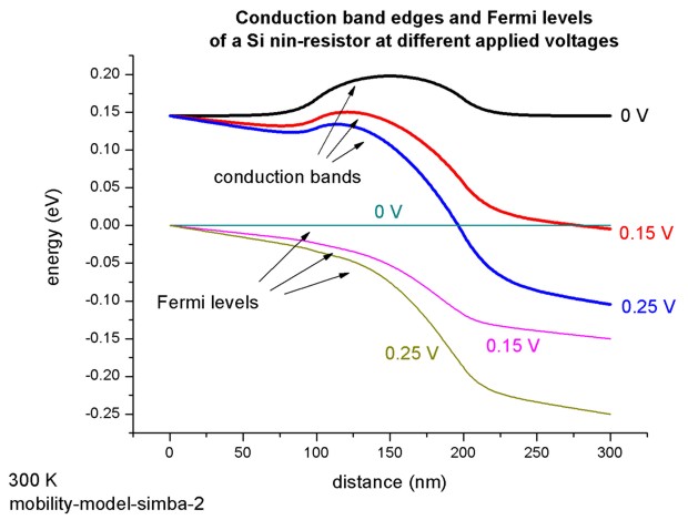 We consider a one-dimensional 300 nm Si-based n-i-n resistor at room temperature, where "n-i-n" stands for "n-doped / intrinsic / n-doped". The intrinsic region and the n-doped regions are each 100 nm wide.