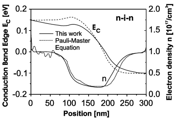 The figure shows the calculated conduction band edges Ec and the electron densities n of the n-i-n structure as a function of position inside the structure. The results obtained from the Pauli master equation (Fischetti (1998), dashed lines) are compared to our quantum mechanical results (full lines).