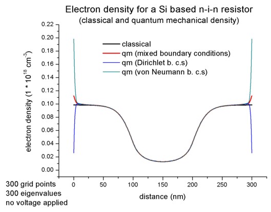 Classical and quantum mechanical electron densities for the n-i-n resistor. Dirichlet boundary conditions force the wave function to be zero at the boundaries and thus the electron density is zero as well. Thus to get a meaningful and physical electron density at the boundaries we have to choose "mixed" boundary conditions. (Note: The feature of using "mixed" boundary conditions for the Schrödinger equation is not supported any more.)