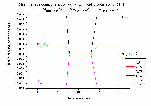 [001] growth direction: The well region is lattice matched to InP, therefore strain is zero. Only the barrier region is subject to strain. The off-diagonal strain tensor components are all zero (exy=exz=eyz=0) as we have [001] growth direction. Al0.70In0.30As has a smaller lattice constant than the substrate material InP (lattice mismatch 1.55 %) leading to tensile strain.
